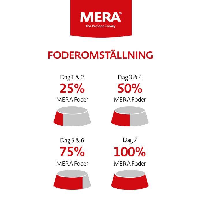 MERA essential hundmat ges normalt torrt. Se till att din hund har fri tillgång till färskt vatten. De rekommenderade uppgifterna är endast ungefärliga värden per dag och måste anpassas för att passa yttre påverkan och hundens utgångsläge.