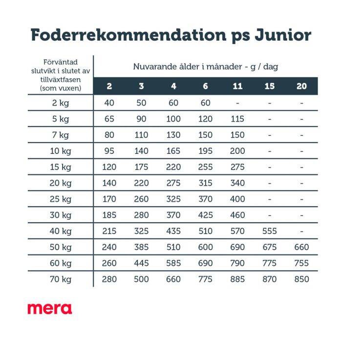 MERA pure sensitive Junior kalkon & ris utfodras normalt torrt. Se till att din valp har fri tillgång till färskt vatten. Den rekommenderade utfodringen är endast ungefärliga värden per dag och måste anpassas för att passa yttre påverkan och hundens individuella behov. Det är viktigt att din valp håller en sund kropp för att undvika belastning på bl.a. leder.