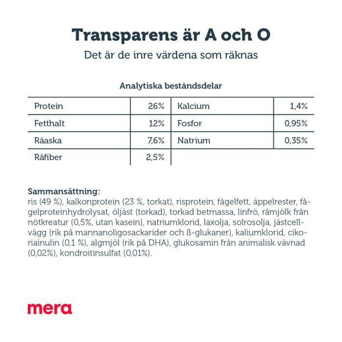 Med MERA skyddskoncept tillhandahåller mera pure sensitive Junior Kalkon & ris ett balanserat recept med aktiva ingredienser för att möta din valp och unghunds dagliga behov. Det är ett komplett helfoder för växande hundar av alla raser i en sensitive-formula med ett begränsat antal ingredienser. Den kan såklart även ges till valpar och unghundar som inte är i behov av en skonsam kost för den som enkelt vill begränsa hundens ingredienslista.