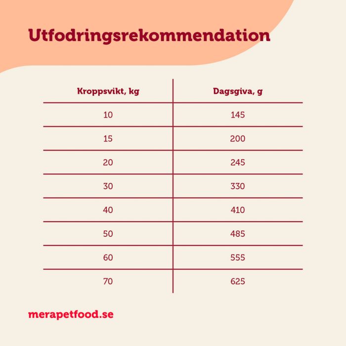 Våra torrfoder utfodras normalt torrt. Se till att din hund alltid har fri tillgång till färskt vatten. Den nämnda utfodringsrekommendationen är bara en riktlinje för balanserad, sund utfodring av din hund. Denna information beräknades i enlighet med den senaste vetenskapliga kunskapen, men måste anpassas till din hunds individuella behov. Eftersom ett enda nummer inte kan täcka alla individuella skillnader och förhållanden som ras, ålder och storlek på hund, rörelsenivå, miljöpåverkan (väder, sommar, vinter) etc.