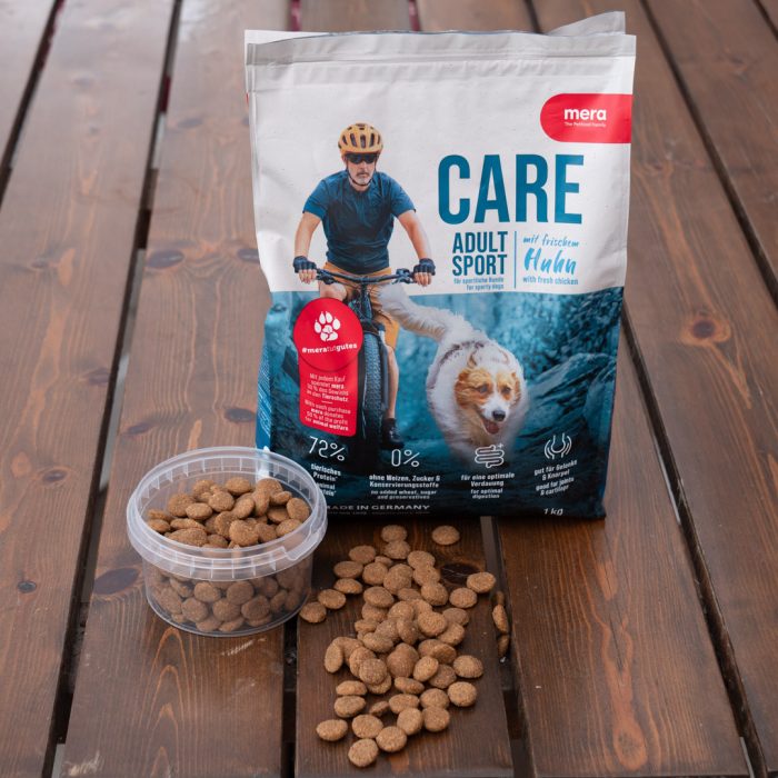 mera CARE adult Sport Chicken – ett komplett hundfoder för vuxna hundar med aktiva dagar och ett högre energibehov. Med extra omtänksamma ingredienser och råvaror i mera CARE är detta en en välkommen del av vårt sortiment av absolut bästa kvalitet.