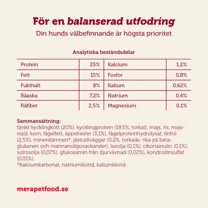 Omsättbar energi (enligt FEDIAF, 2018) 15,98 MJ/kg (3816 kcal/kg).
