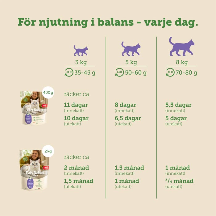 Rekommendationerna utgör riktvärden per dag och måste anpassas efter yttre omständigheter och kattens individuella behov.
