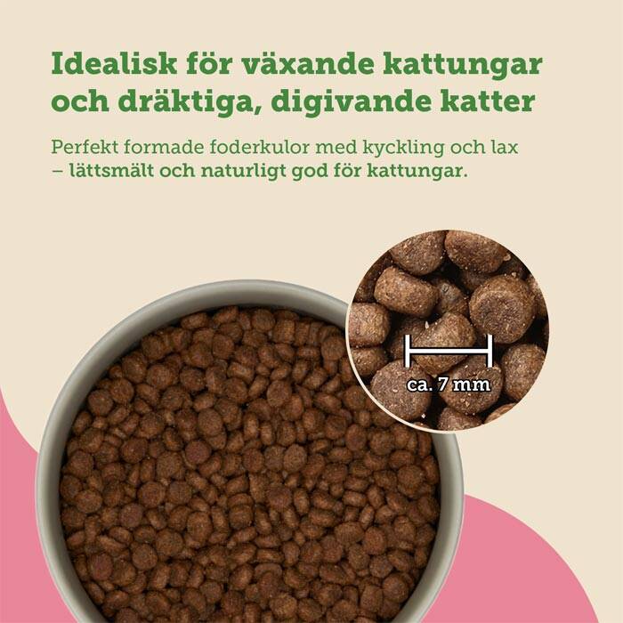Med färsk lax och kyckling från gårdar med hög djurvälfärd får kattungen en proteinrik kost som är både artanpassad och naturligt smakrik. Receptet är utan spannmål och tillsatt socker, lättsmält och fritt från onödiga tillsatser som färgämnen och konserveringsmedel.