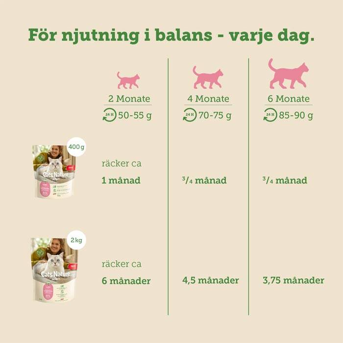 De första månaderna är avgörande för kattungens utveckling. Därför har vi tagit fram mera Cats Nature Kitten Salmon, ett premiumfoder som kombinerar njutning och omsorg i varje tugga. Anpassat för kattungar från 2 till 12 månader – och för kattmammor som är dräktiga eller digivande – ger fodret en balanserad näring som stödjer en harmonisk tillväxt och en stark start i livet.
