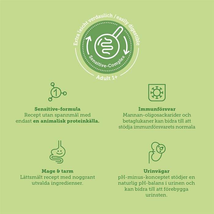 Den balanserade sammansättningen innehåller 48 % animaliskt mono-protein och är helt utan spannmål och tillsatt socker, samt fri från onödiga tillsatser som färgämnen och konserveringsmedel. Fodret innehåller vårt noggrant framtagna Sensitive-Complex, som kan bidra till kattens välbefinnande på flera viktiga områden: