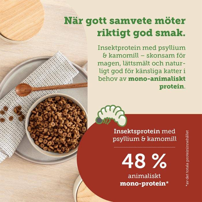 Receptet bygger på insektsprotein som enda animaliska proteinkälla, vilket gör fodret lättsmält och särskilt lämpligt för katter med känslig matsmältning eller allergier. Insektsprotein är inte bara ett skonsamt alternativ för katten – det är också ett hållbart val för miljön, med lägre koldioxidavtryck och mindre vatten- och markanvändning än traditionell köttproduktion.