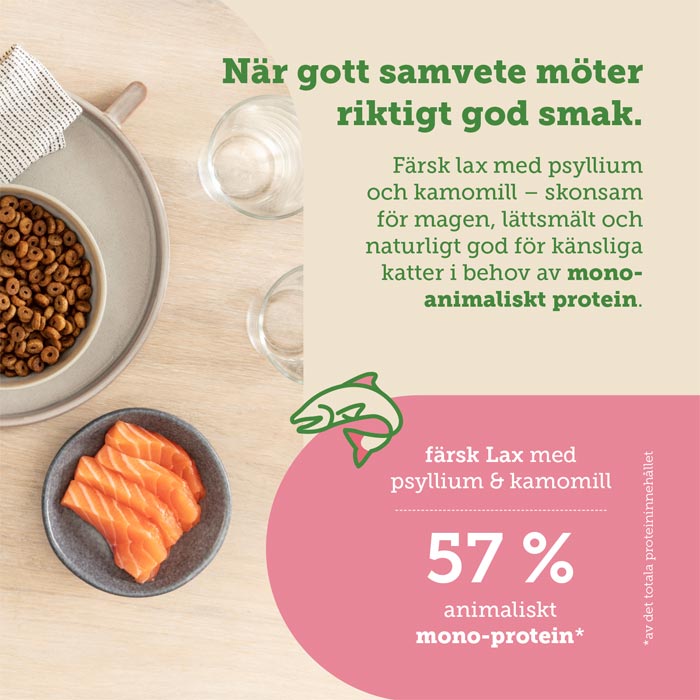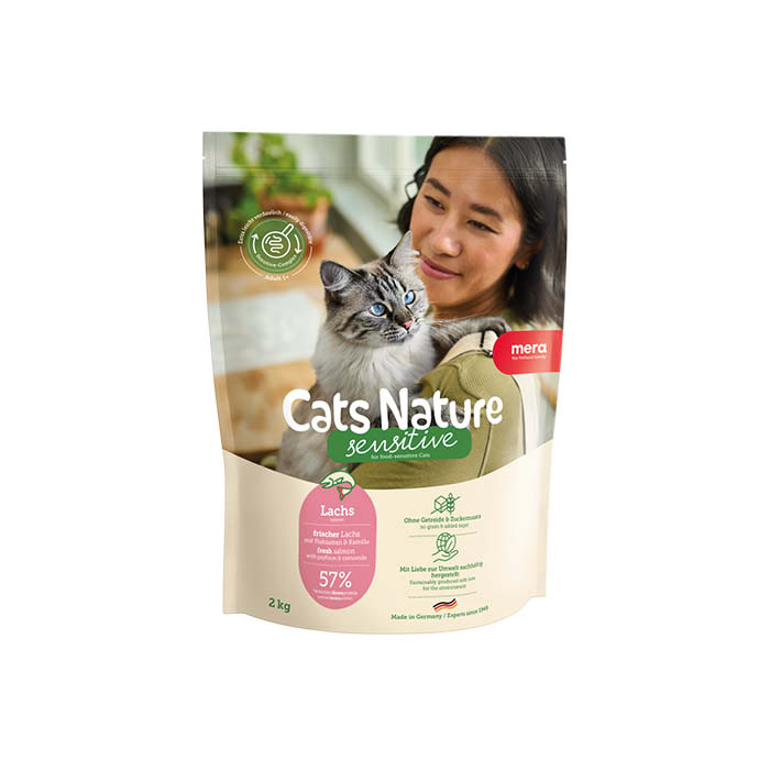 mera Cats Nature sensitive Salmon är utvecklad för känsliga vuxna katter från 1 års ålder med färsk lax, psyllium och kamomill