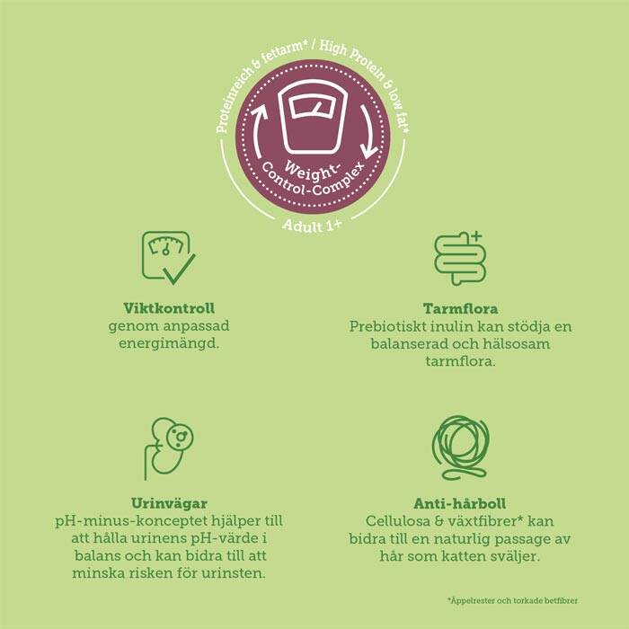Med 80% animaliskt protein från färsk lax och kyckling från gårdar med hög djurvälfärd får din katt en proteinrik måltid som samtidigt har 30% mindre fett än mera Cats Nature Adult. Den höga proteinhalten och den låga fetthalten är grunden i vårt Weight-control-komplex, som kan bidra till att hålla vikten stabil och musklerna starka.