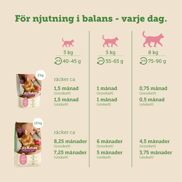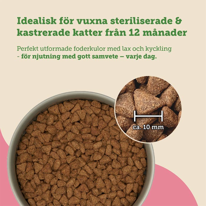 När katten är kastrerad eller steriliserad förändras kattens näringsbehov. Ämnesomsättningen sjunker, aptiten ökar och många katter blir mer benägna att gå upp i vikt. Därför har vi utvecklat mera Cats Nature Sterilised/Light Salmon, ett premiumfoder för katter som kombinerar smakupplevelse med ett genomtänkt näringskoncept.