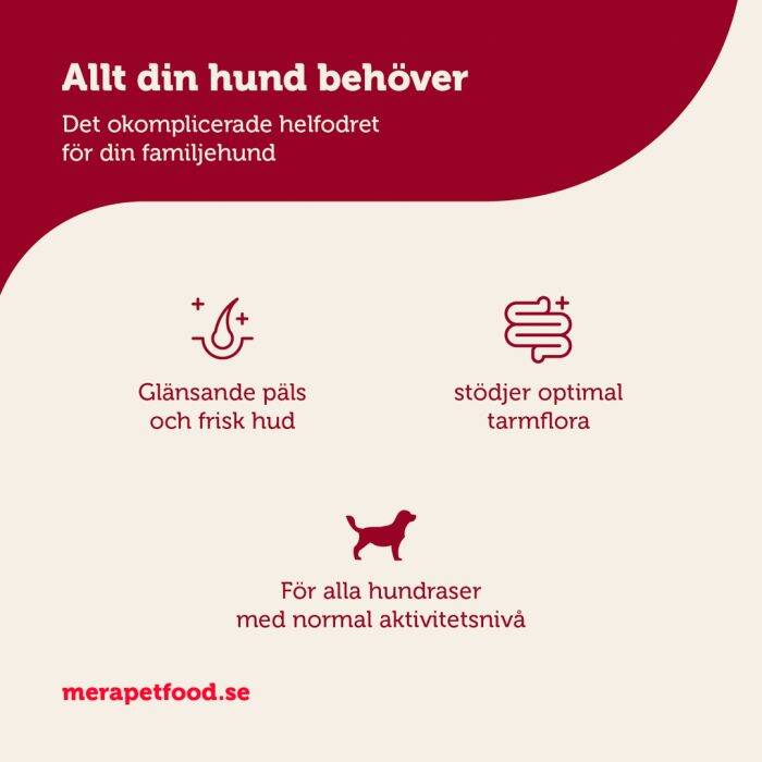 det totala protein och energiinnehållet är optimalt anpassat till behoven hos normalt aktiva hundar.