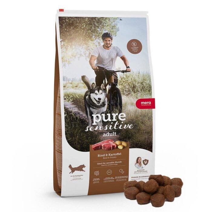 mera pure sensitive Nötkött & potatis med färskt kött är ett särskilt smakfullt helfoder för känsliga vuxna hundar med högt energibehov