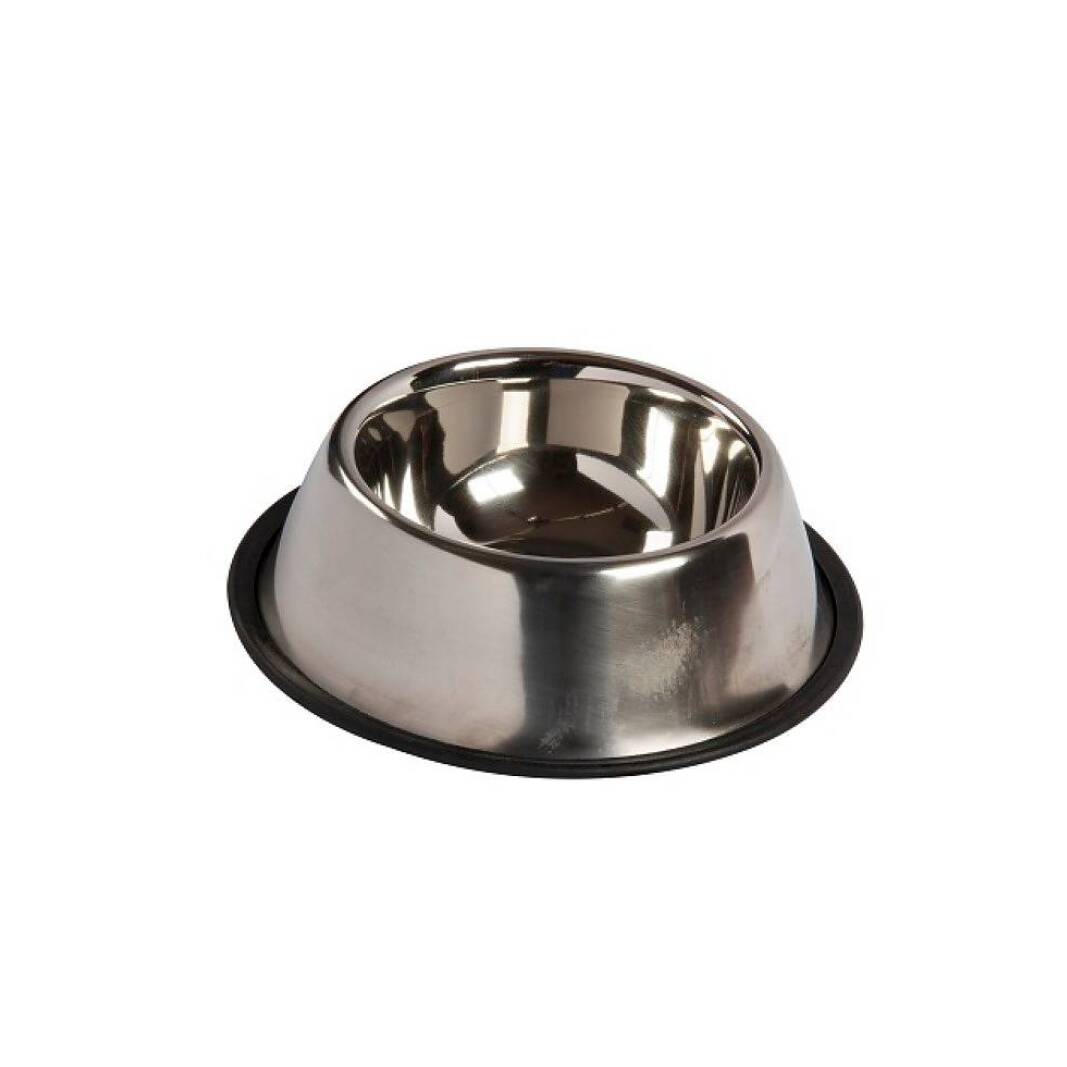 Rostfri matskål 0,9 liter med höjda kanter för att motverka att raser med hängande öron ska få öronen i mat- eller vattenskålen.