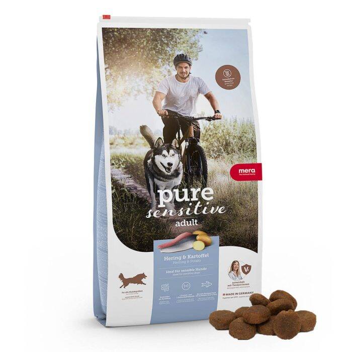 mera pure sensitive Sill & potatis – komplett, spannmålsfritt helfoder för vuxna hundar med ökat energibehov.