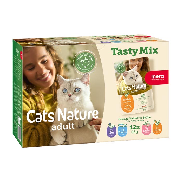mera Cats Nature Adult Multibox är den perfekta lösningen för kattägare som vill erbjuda sin katt variation, smakglädje och naturlig näring – varje dag. I denna premiumbox hittar du 12 portionspåsar av vårt högkvalitativa våtfoder för vuxna katter, med fyra utsökta smaker: anka, forell, lax och kyckling. En naturlig smakupplevelse som gör varje måltid till en njutning.