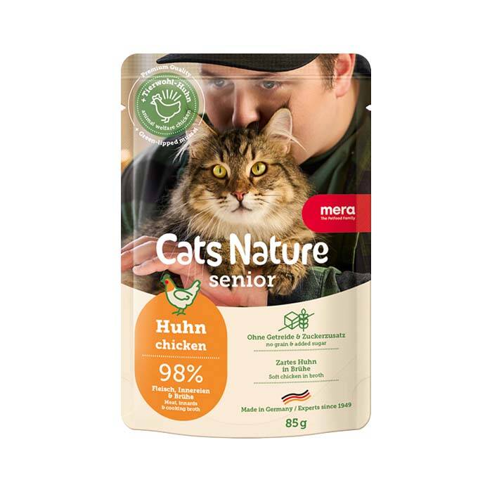 mera Cats Nature Senior Chicken är ett premium våtfoder speciellt utvecklat för äldre katter från 8 års ålder. Receptet är anpassat för att stödja vitalitet, rörlighet och välbefinnande även i livets lugnare fas.