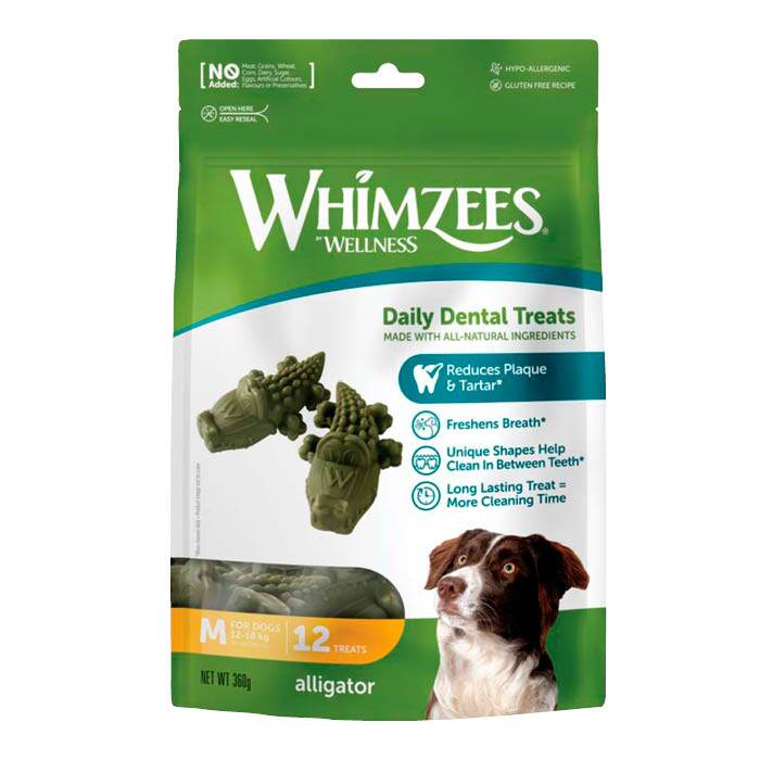 Detta paket innehåller 12 st Whimzees Alligator i storlek M (ca 30 g per tugg). Rekommenderas för hundar: